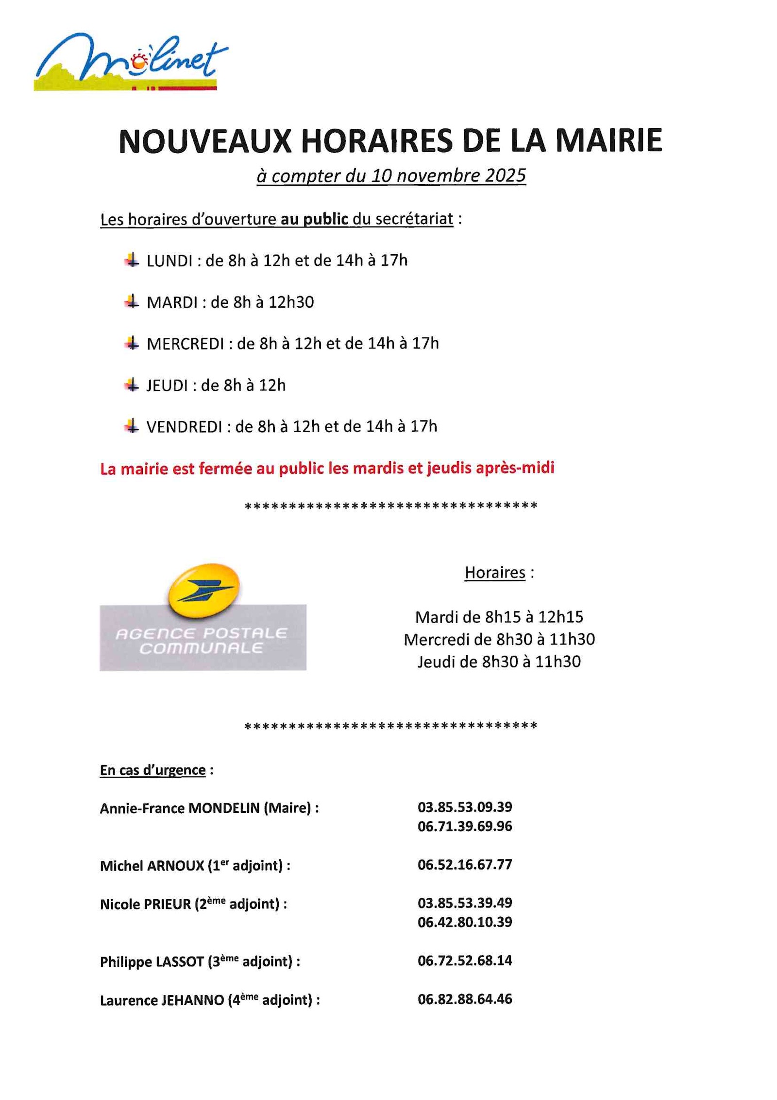 En raison du départ de 𝐒𝐭𝐞́𝐩𝐡𝐚𝐧𝐢𝐞 𝐁𝐎𝐔𝐃𝐈𝐍 (secrétaire de mairie) pour une nouvelle carrière, nous vous informons des nouveaux horaires d'ouverture 𝐚𝐮 𝐩𝐮𝐛𝐥𝐢𝐜 (à compter du 10 novembre 2025).