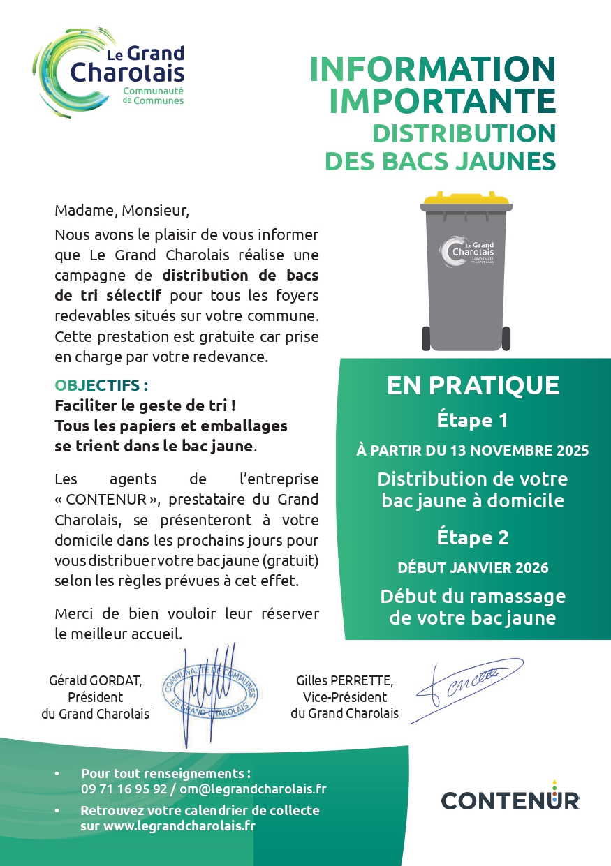 Nous vous informons que 𝐥'𝐞𝐧𝐭𝐫𝐞𝐩𝐫𝐢𝐬𝐞 "𝐂𝐎𝐍𝐓𝐄𝐍𝐔𝐑" passera dans la commune 𝐝𝐮 𝟏𝟖 𝐚𝐮 𝟐𝟓 𝐧𝐨𝐯𝐞𝐦𝐛𝐫𝐞 𝐩𝐫𝐨𝐜𝐡𝐚𝐢𝐧 pour la distribution de bacs jaune à domicile.